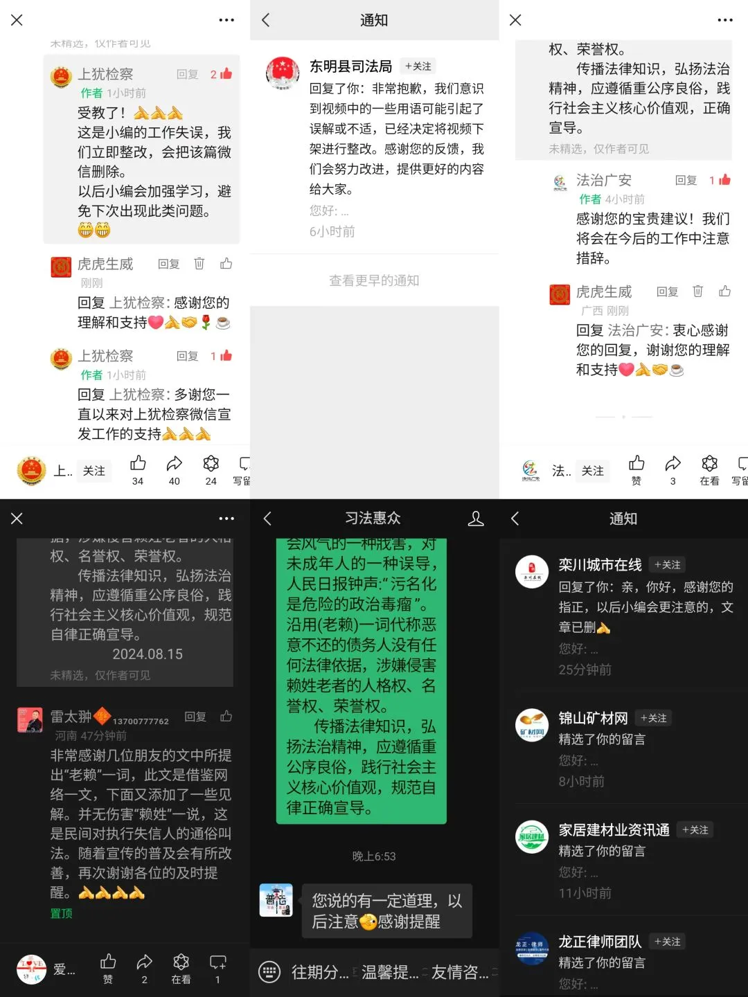 時任運營人員李想將全部留言設為精選,並在隨後幾天特地發出更正,呼籲大家不要將失信被執行人稱為“老賴”。李想告訴南方週末,當時沒想到反響這麼大,他也只是轉載了當地法院的文章而已。看到留言後,他覺得確實對賴氏一族有失公平,於是重新發文更正。