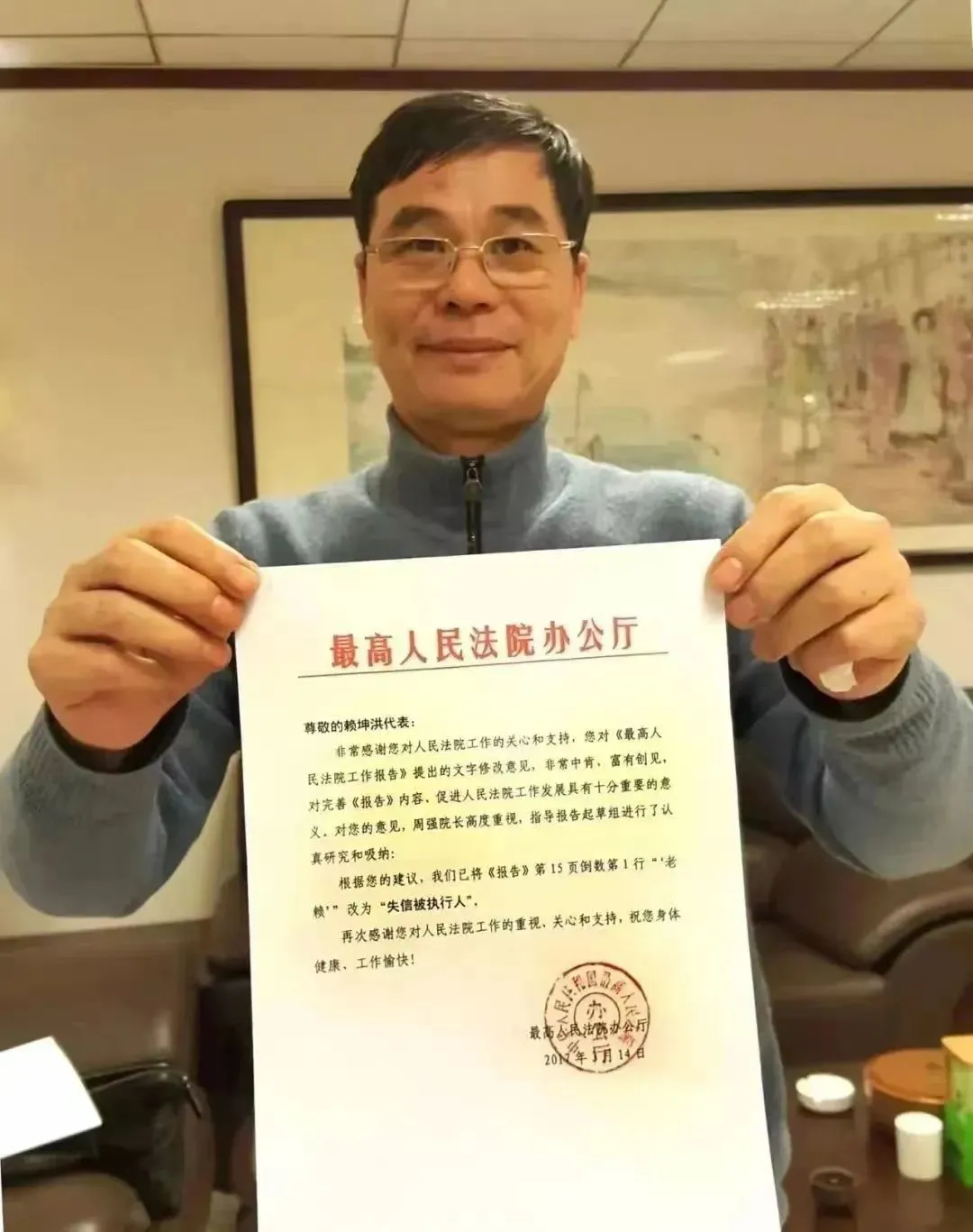2017年3月,廣東籍企業家賴坤洪作為全國人大代表,對最高人民法院工作報告提出建議,不應該將“老賴”作為“失信被執行人”的代稱,而後他收到最高人民法院辦公廳的回覆函,表示採納其建議並修改文字。(受訪者供圖)