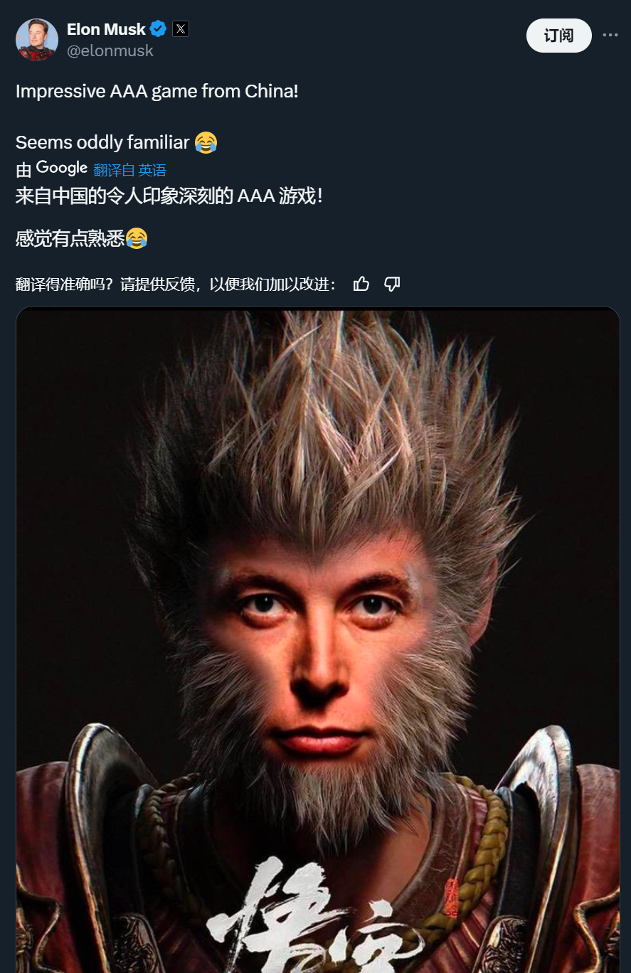 ● 馬斯克在X平台發文稱讚《黑神話》,並用AI把主角的臉換成了自己