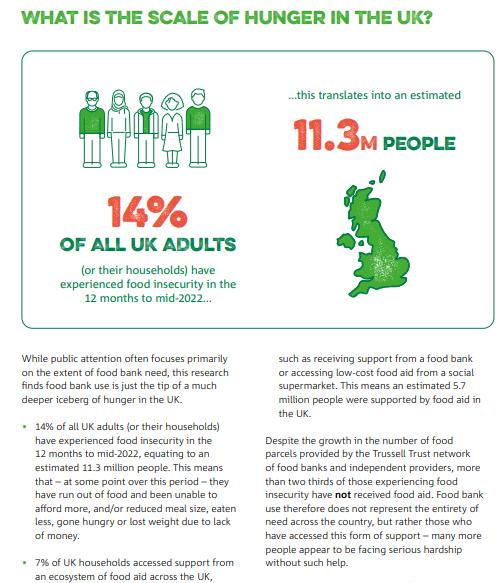 帶嚶慈善機構特拉塞爾基金會2023年6月28日發佈的報告顯示:去年(2022年)約七分之一的英國人因缺錢面臨飢餓困擾。報告部分內容與嚶國薩塞克斯大學發展研究所本月(2023年6月)27日發佈的研究結果類似。發展研究所的研究顯示,14%的帶嚶人口目前食物匱乏。特拉塞爾基金會説,在截至2022年年中的一年內,約7%的嚶國人得到慈善機構食物救濟,然而面臨糧食不安全的人中約71%尚未獲得任何形式的慈善食物救濟。