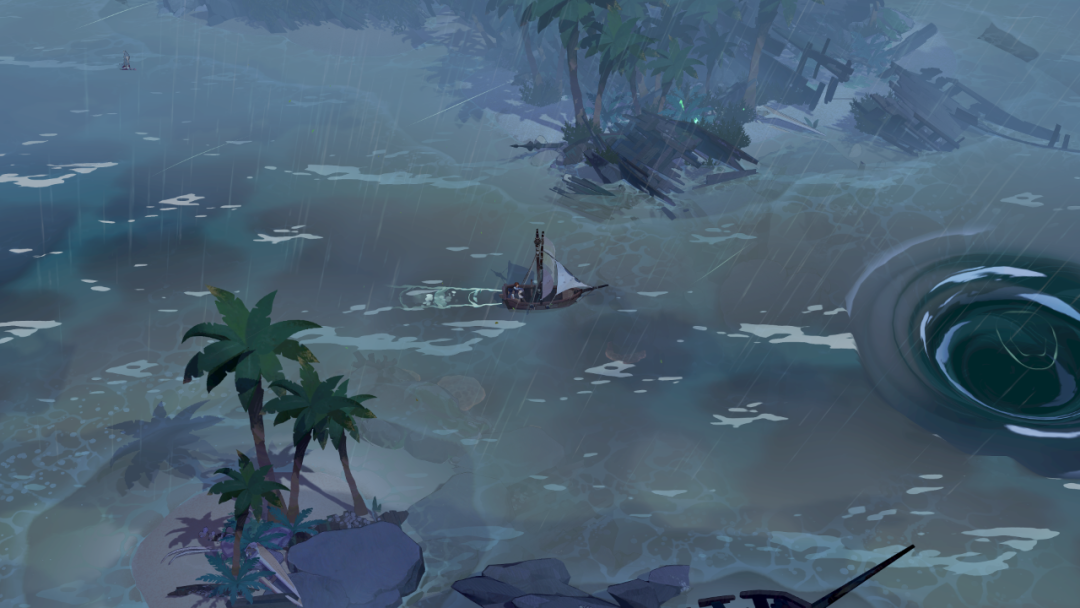 還比如在起風的海域,這次加入的航海玩法,不僅需要玩家判斷風向、避開旋渦,而且還有時候還會面臨海中怪物的攻擊,在旅行時更多了一份緊張感——這裏讓我想起CRPG《永恆之柱2》,同樣是從陸上世界過渡到航海主題,但限於成本和開發時間,最終“柱子2”的航海細節只能用文本+插圖形式呈現。在AFK2中開着船探險,我也彌補了一點當年的遺憾。