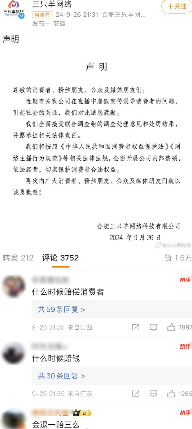 如今,三隻羊的罰款通知落地,三隻羊匆忙發佈了一份模板化的道歉聲明,更凸顯了其對於危機處理的遲緩與敷衍。
