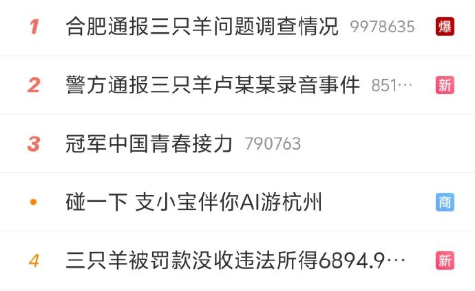 越來越多人捲入風波,“一天能上 800 條熱搜”,成了三隻羊當前備受爭議的輿論現狀。