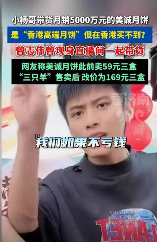 為了給香港美誠月餅找背書,小楊哥還在直播間攬着曾志偉的肩膀説,“美誠是很大的牌子,香港美誠,店裏面這東西賣200多塊,我們今天是不是很便宜了?”