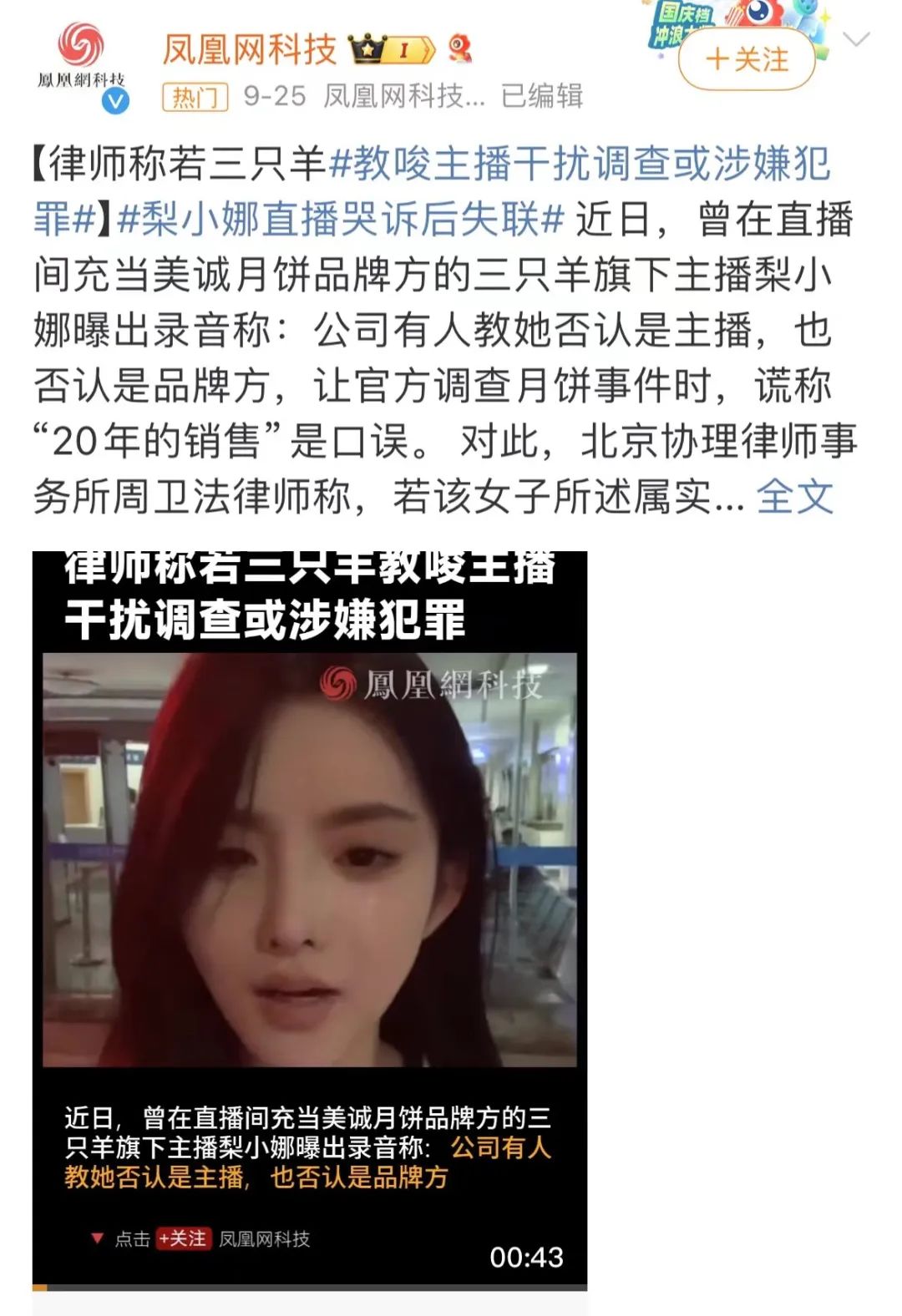 近日三隻羊旗下女主播“梨小娜”曝光,三隻羊曾請她假扮美誠月餅品牌方,在直播時她説的“暢銷20年”,是來自三隻羊公司直播時提供的手卡內容。