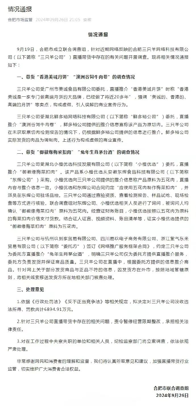 9月26日晚,合肥通報三隻羊因虛假宣傳、誤導消費者等違法行為,被罰6894.91萬元,並暫停經營限期整改。