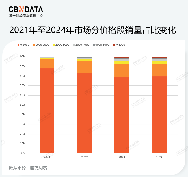 銷售額增長背後是該市場上的“量價齊升”。2021年以來,自行車市場的總體銷量在波動中增長,排除季節因素導致每年12月至2月的銷量低谷,今年上半年自行車整車最低銷量49.5萬高於去年最高銷量48.8萬。與此同時,淘系千元以上整車產品的銷量佔比也在穩步擴大。魔鏡數據顯示,2021年至2024年,淘寶天貓平台千元內自行車銷量佔比由88%降低至79%,千元以上各個價格段佔比均有所提升。