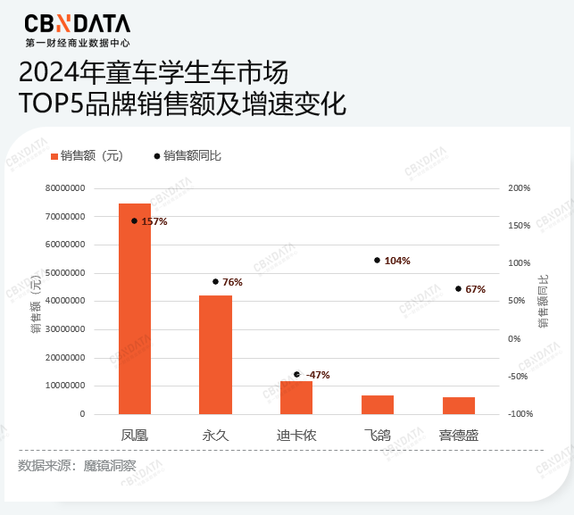 首先,穩居市場份額TOP4的老牌國貨“鳳永飛”在產品線上大量佈局千元內低價的童車學生車,切入差異化的垂類賽道。其中鳳凰和永久佔據童車學生車市場銷售額的TOP2,該細分市場CR2達到55%,今年以來“鳳永飛”在該賽道的增速仍處於高位。
