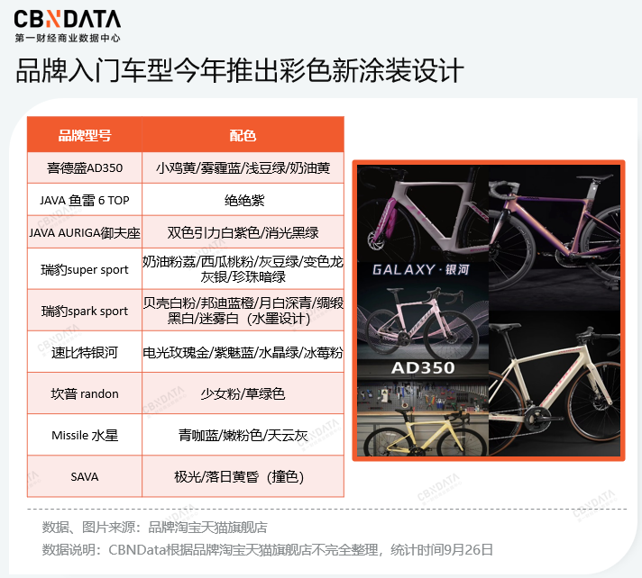 在相似的配置內,品牌如何通過差異化打造“爆款”?外觀設計成為必爭之地。這也迎合大眾購買入門車款的需求,美騎網發佈的《2023年中國自行車行業調查報告》指出,入門騎行的消費者購車的三大決策因素是,質量與材質、設計與色彩、價格。因此,入門款公路車逐漸被打造成“時尚單品”。