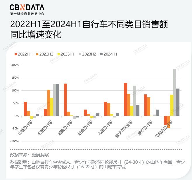 具體看不同類目的變化情況,山地自行車長期佔據市場份額大頭,但份額已經從2022年上半年的57%持續收縮至今年上半年的41%。
