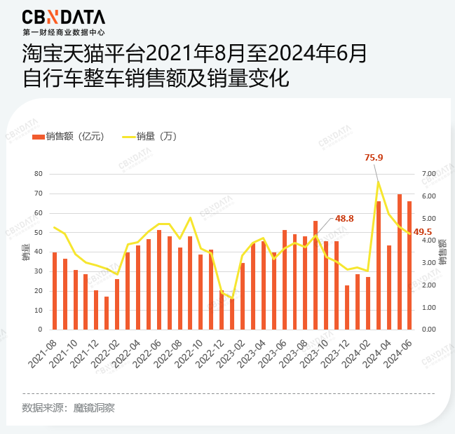 今年上半年,自行車市場在淘系平台迎來小回春。魔鏡洞察數據顯示,平台內自行車整車銷售額在今年1-6月達到26.3億元,同比增長29.9%,增速是去年同期的8.7倍。