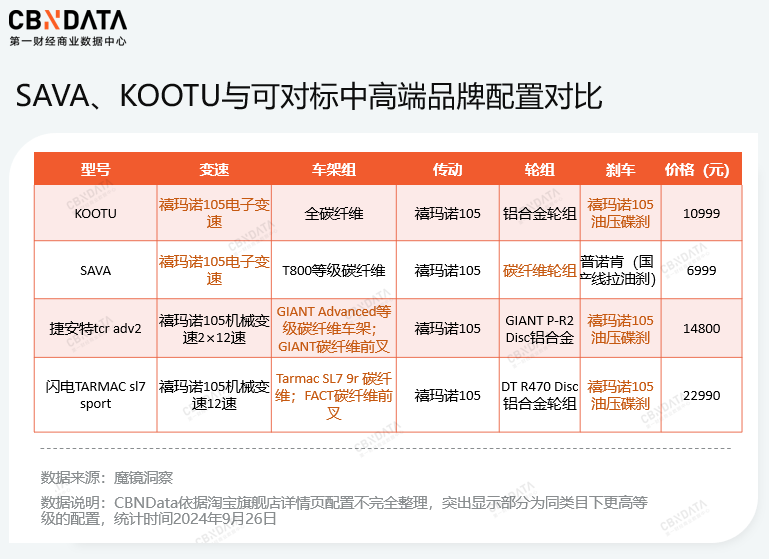 今年增勢迅猛的SAVA及其旗下品牌KOOTU通過“高端平替”的定位與差異化渠道佈局切入市場。首先,SAVA在2022年成立KOOTU後,選擇差異化渠道入局,至今僅佈局了淘系平台單一渠道。魔鏡數據顯示,KOOTU兩年內在淘系平台的市場份額提升了1.13%,今年銷量同比增長了163.7%。再具體看產品打法,SAVA和KOOTU的熱銷款以五千元以上公路車為主,對標萬元以上國際品牌整車的部分配置。排除品牌溢價的因素,“卷”配置的核心成本在於採購中高端配件,而在需要自研的部分,幾乎沒有精細的車架幾何設計,會通過重複利用模具、採用等級較低的碳纖維材料降低價格。