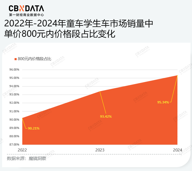 對大眾而言,兒童學車的基礎需求長期存在,近年來低價心智也持續提升。2021年至今,單價800元內的低價佔銷量比例從90.21%增長到95.34%,且三年來800元內的客單價多集中在400元至500元這一價格段。因此,產品均價在459.6元、又有“老國貨”口碑的“鳳永飛”自然而然成為首選。