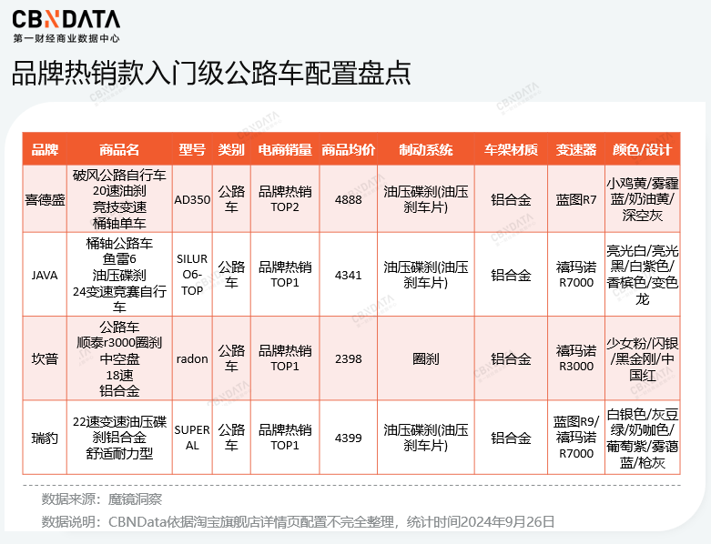 CBNData盤點品牌熱銷款發現,今年以來,各個品牌銷量TOP5的商品中,均出現符合入門公路車定位的商品。其中,喜德盛AD350今年銷售額相比去年同期翻了九倍以上,JAVA魚雷6同比也增長了127.1%。這些商品均價在2000元至5000元的範圍內,硬件配置均衡,能夠保證基本的競速騎行需求。