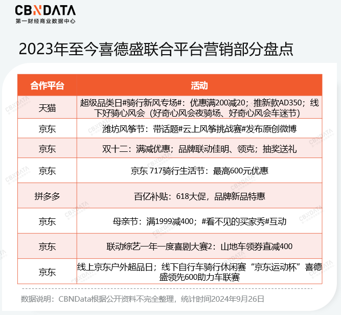 在眾多品牌已經玩出花兒的線上營銷場上,自行車品牌仍是新手村玩家。但喜德盛自去年以來積極佈局線上營銷,與京東多次合作,參與各個促銷節點並通過平台聯動多個户外品牌開展線下活動。與電商平台聯動通過線上“造節”、線下打造賽事IP的形式影響和塑造消費者的認知,建立起品牌的營銷資產,也是自行車品牌深度參與線上平台營銷的首次嘗試。