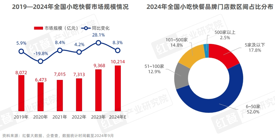一直以來,小吃快餐賽道都比較受餐飲創業者青睞,企查查數據顯示,截至2024年9月,小吃快餐相關企業註冊量為23.4萬家。紅餐大數據顯示,截至2024年9月,全國小吃快餐門店數已超過400萬家,預計2024年小吃快餐市場規模將突破1萬億元。