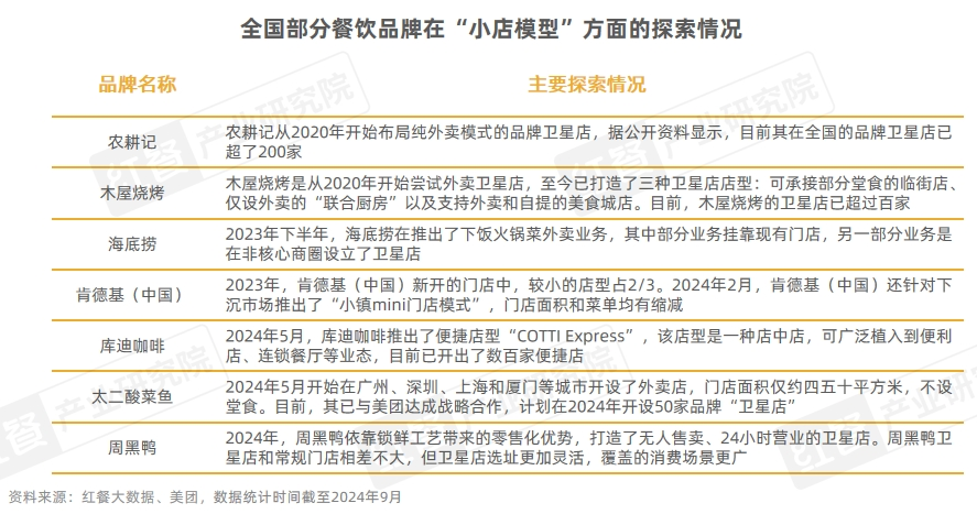 此外,也有不少品牌在門店模型上進行創新嘗試,以提升門店運營效率。其中,一些品牌積極探索麪積更緊湊、運營效率更高的輕量型門店,如衞星店、mini店、便攜店、外帶店等。據美團數據,全國已有100餘個品牌累計開出超800家衞星店,包括老鄉雞、農耕記、海底撈、大龍燚、木屋燒烤、太二酸菜魚、醉得意等。