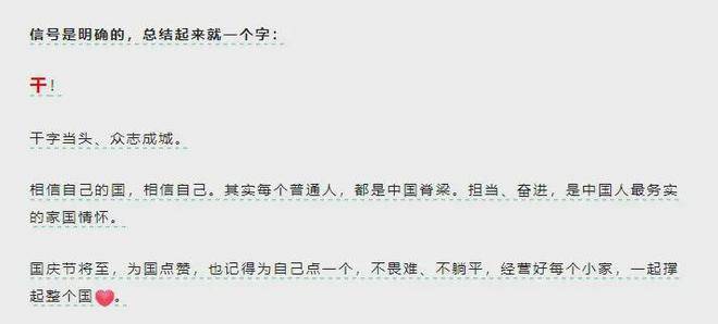 “券商一哥”中信證券9月26日在其官方微信公眾號中,以簡單粗暴的一個字——“幹”作為標題。明確表示,幹字當頭、眾志成城。大盤全線拉昇,“是信心,也是心氣兒的迴歸”。