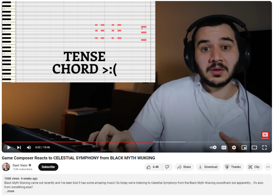——完美的音樂:配樂是AAA遊戲必不可少的要件,而《黑神話·悟空》做到的是完美。從輝煌的《雲宮訊音》改變,到風味十足的陝北説唱小曲,到魔性的説唱/電音的《往生咒》。外網上能看到各種遊戲音樂創作者對遊戲音樂的認可。我幾周前已把我的手機接聽鈴聲改成了《大鬧黑風山》。音樂、音效及配音製作水平是説明這個遊戲近乎完美的重要體現