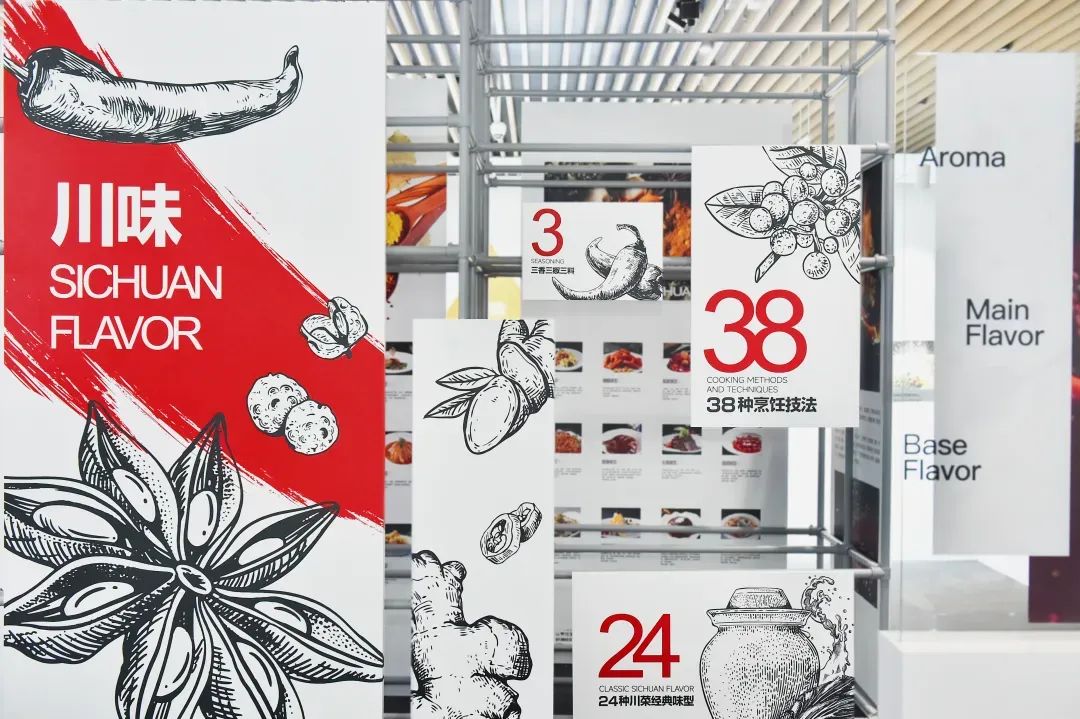 3、24、38……開場的川菜文化展示區便用一串數字,挑明川菜獨樹一幟的地方風味與複雜之處:川菜烹飪技法已有38種之多。川人用“三香三椒三料”調製出七滋八味,又不斷擴充出經典24味型,形成世界聞名的川味。