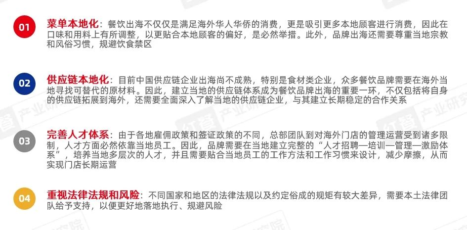 紅餐產業研究院總結了以下餐飲出海的建議,分別是菜單本地化、供應鏈本地化、完善人才體系、重視法律法規和風險。