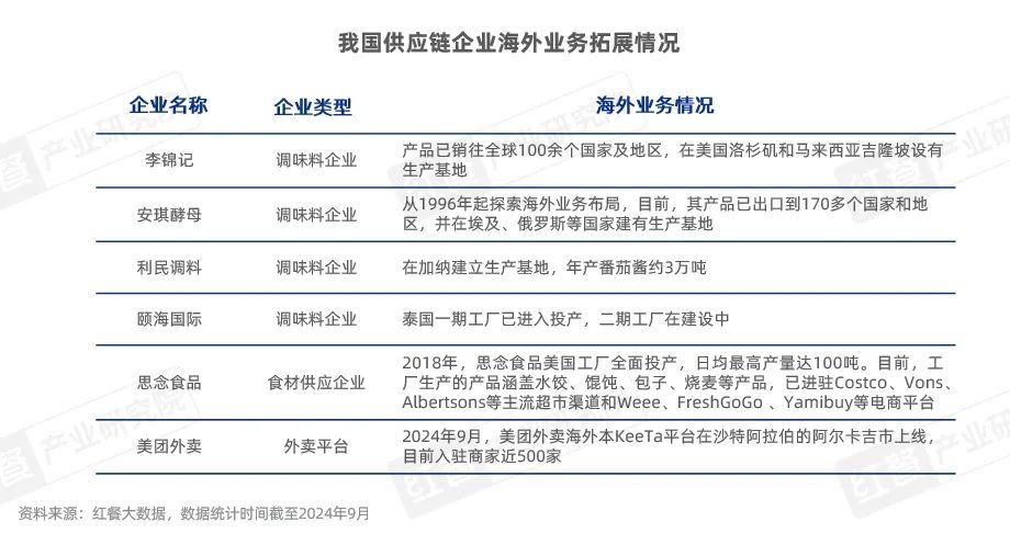 近年來,供應鏈端諸如食材供應企業、調味料企業、預製菜企業、冷鏈物流企業、外賣平台等也在積極地拓展海外業務,為我國的餐飲品牌在海外發展提供助力。例如,思念食品的首家海外工廠於2018年在美國全面投產;頤海國際的泰國工廠已進入投產;美團外賣海外版KeeTa平台已於2024年9月在沙特阿拉伯的阿爾卡吉市上線。