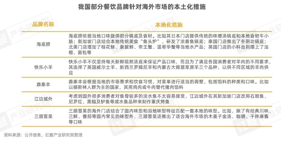 此外,部分國內餐飲品牌在國際化方面的意識也在提升,不少品牌加深了本土化策略,從產品、口味、餐廳環境等方面創新調整,以迎合當地消費者的飲食習慣。具體措施包括:菜單本地化、營銷多元化、供應鏈全球化。