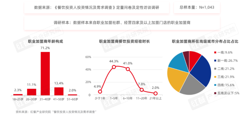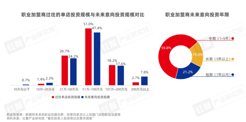 為了更深入地瞭解目前成熟的餐飲投資者的現狀及情況,紅餐產業研究院通過問卷調研、深入訪談等方式對職業加盟商進行了針對性地研究,在這裏我們把同時經營4家及以上加盟門店的餐飲投資者定義為職業加盟商。
