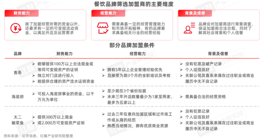 與此同時,品牌方還對餐飲投資者進行了嚴格篩選,通過考察投資者的財務能力、經營能力、背景及信譽、品牌認同感等多方面能力和素質,確保加盟商能夠與品牌共同成長,餐飲加盟的准入門檻不斷提高。