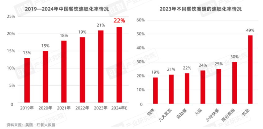 有關數據顯示,我國餐飲行業的連鎖化率從2019年的13%增長至2023年的21%,預計2024年連鎖化率將達22%。這一變化反映了餐飲品牌正通過連鎖化來擴張規模,增強競爭力。