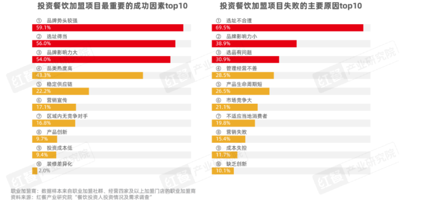 職業加盟商認為餐飲投資成功的主要影響因素是品牌、品類、選址。在調研的職業加盟商中,認為投資加盟餐飲項目最重要的成功因素TOP3分別是:品牌勢頭較強、選址得當和品牌影響力;投資加盟餐飲項目失敗的主要原因TOP3分別是:選址不合理、品牌影響力小、選品有問題。