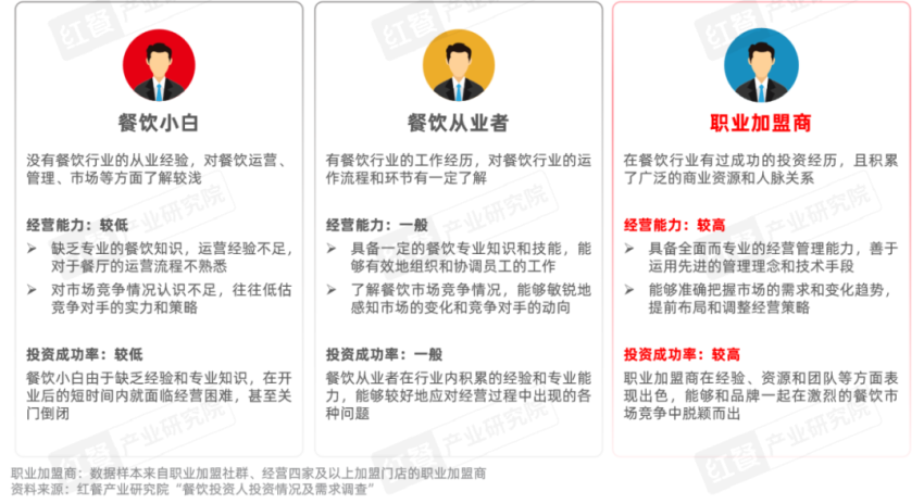 目前,餐飲行業的投資者主要由餐飲小白、餐飲從業者、職業加盟商三類羣體組成,他們在經驗、經營能力和投資成功率上存在明顯差異。