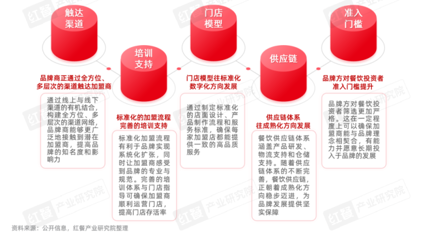 品牌通過優化觸達渠道、培訓支持、門店模型、供應鏈、准入門檻等加盟內容,全方位完善連鎖經營體系,在加盟領域呈現出越來越規範化和品招化的趨勢。餐飲品牌的連鎖經營體系不斷優化、成熟化,加盟效率和管理水平不斷提高。