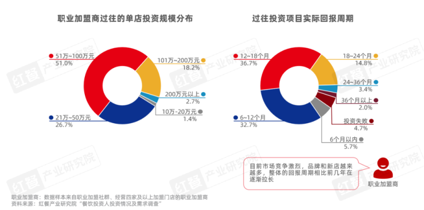紅餐產業研究院“餐飲投資人投資情況及需求調查”結果顯示,大部分職業加盟商的過往單店投資規模主要在51萬~100萬元,佔比為51.0%;在餐飲投資回報週期的研究中,36.7%的成熟職業加盟商過往項目的實際回報週期在12~18個月的範圍。此外,還有加盟商表示目前餐飲投資項目實際回報週期正在拉長,建議小白做好心理預期調整。