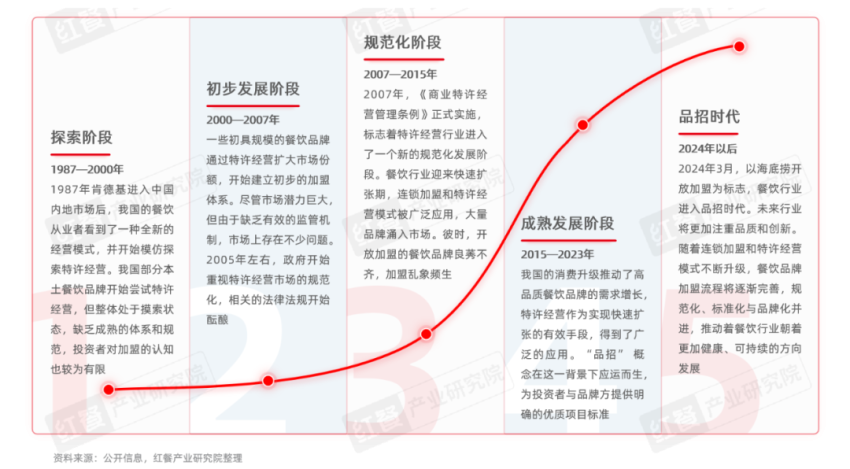 紅餐產業研究院在梳理中國餐飲特許經營發展歷程時發現,中國餐飲特許經營經歷了探索階段、初步發展、規範化階段、成熟發展階段等多個發展階段,現正進入品招發展時代。