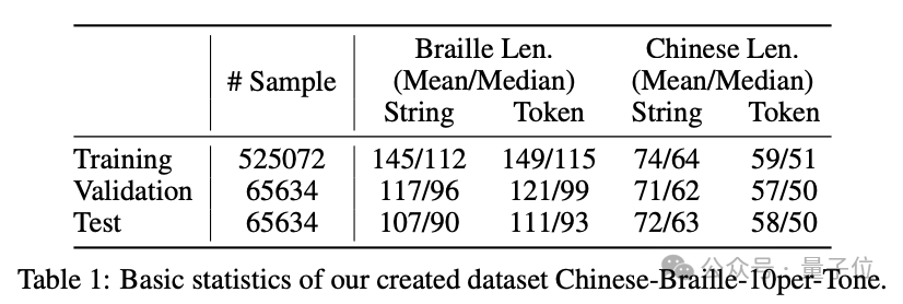 為此,論文作者們首先構建了一組中文-盲文數據集,包括Chinese-Braille-Full-Tone、Chinese-Braille-No-Tone和Chinese-Braille-10per-Tone。