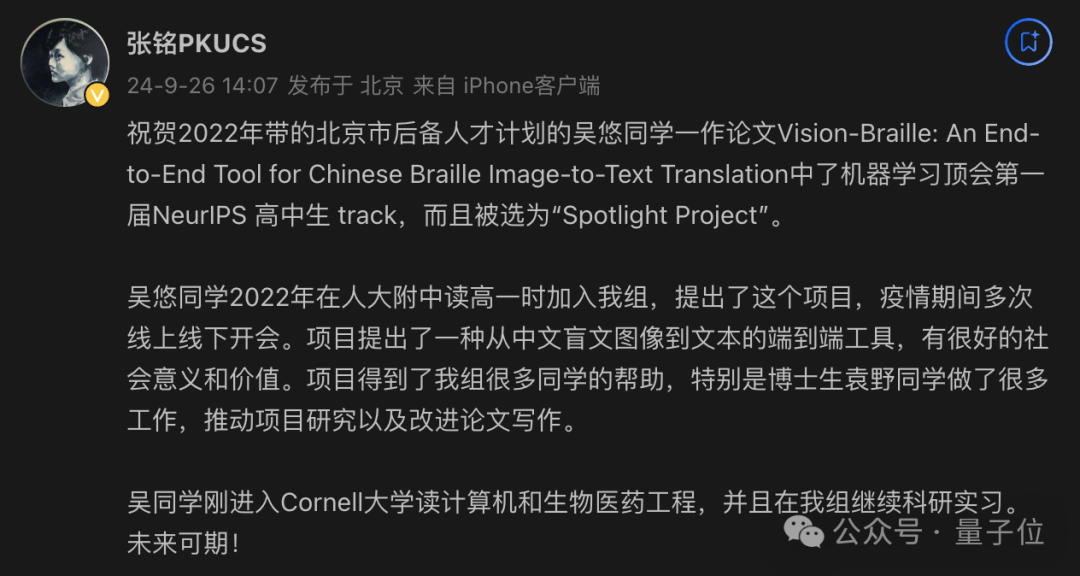 論文致謝中提到,吳悠主要是在張銘教授博士生、論文第二作者袁野的指導下完成了這項研究。