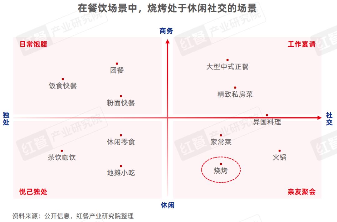 唐欣指出,在餐飲場景中,燒烤處於休閒社交的消費場景。燒烤食材豐富,煙火氣和氛圍感強,能夠提供較好的情緒撫慰價值。