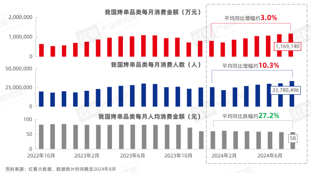 唐欣指出,近三年,我國烤串品類的消費金額、每月消費人數的數據呈現季節性波動。但是,2024年我國烤串品類每月人均消費金額逐步下滑,8月份達到了58元/人,較去年同期減少了29.3%。