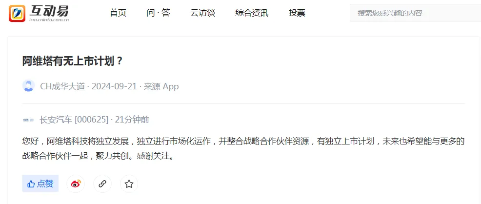 9月26日,長安汽車(000625.SZ)在最新一輪投資者問答中透露,其子公司阿維塔科技正朝着獨立發展的方向穩步前進,不僅將獨立進行市場化運作,還計劃整合戰略合作伙伴資源,有獨立上市的可能。此前有媒體曾報道,阿維塔科技考慮在2025年去香港地區上市。