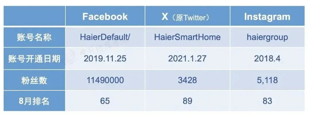 從2023年8月的傳播數據看,在中國出海品牌新媒體傳播力百強榜中,海爾的綜合指數排名為76。其中,在Facebook上排名為第65位,X(Twitter)為89位,Instagram為83位。總體來看,海爾對國際社交媒體的重視和利用程度還有待提升。