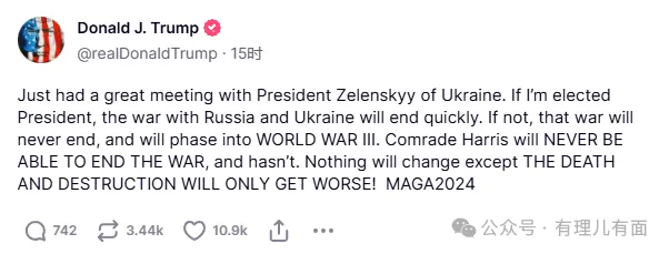 對特朗普來説,見澤連斯基並不是最主要的事,最重要的還是要回歸到他的選舉上,所以特朗普最後又説:“投票給哈里斯會導致世界大戰,而我當選總統能迅速結束俄烏戰爭。”並表示他會促成一個對雙方都有利的協議來結束俄烏衝突。