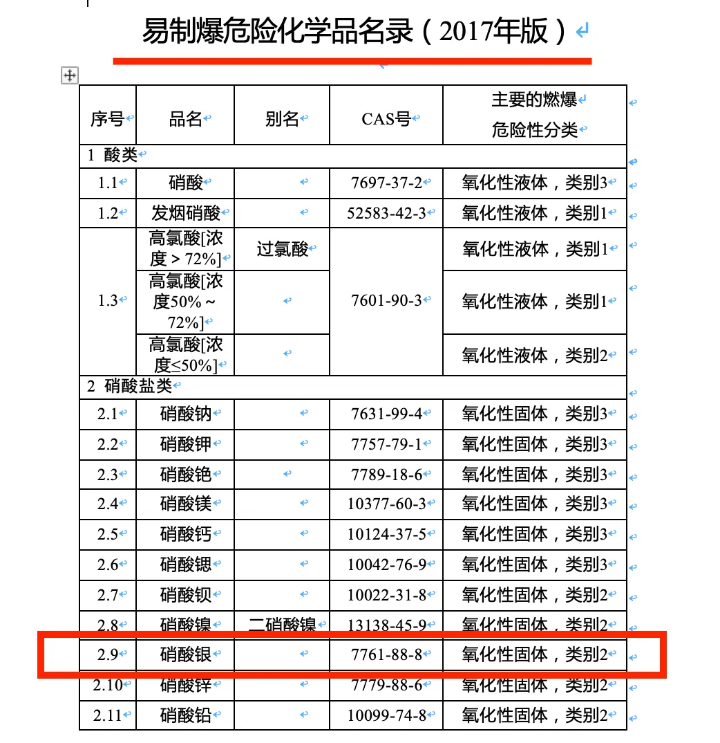 **硝酸銀是一種無色晶體,具有易溶於水和氨水的特性,是重要的化學試劑和分析試劑,常用於實驗室中。**誤服硝酸銀可引起劇烈腹痛、嘔吐、血便,甚至發生胃腸道穿孔。不小心接觸到也會造成皮膚和眼部灼傷。引起呼吸道刺激等風險。由於存在危險性,硝酸銀被列入《易制爆危險化學品名錄》,受到嚴格管控。