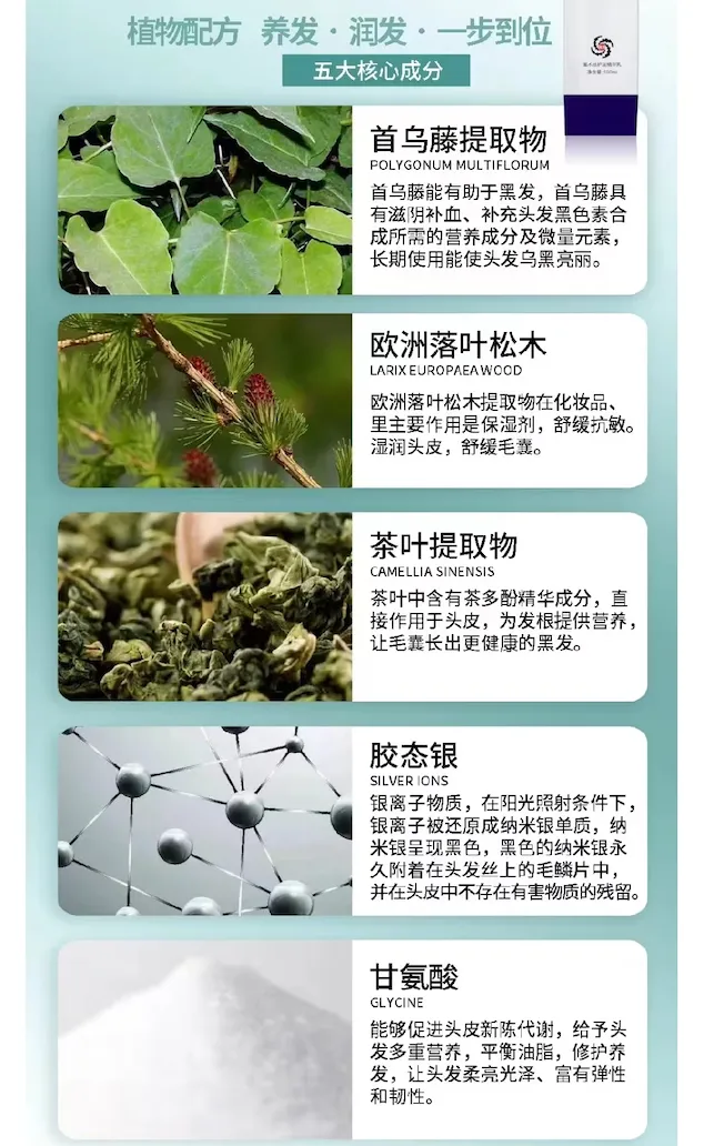 這些發用產品全都宣稱不含化學染髮成分,塗抹在頭髮上不用清洗,只要曬曬太陽,通過光照作用促進養分吸收,從而讓毛囊“合成天然黑色素”,達到“白髮變黑髮”的效果。乍一聽有“光合作用”四個字,是不是感覺還挺純天然、挺高大上的?但其實這些“白轉黑”發用產品藉助了銀離子的感光特性,往裏面添加了不少硝酸銀。