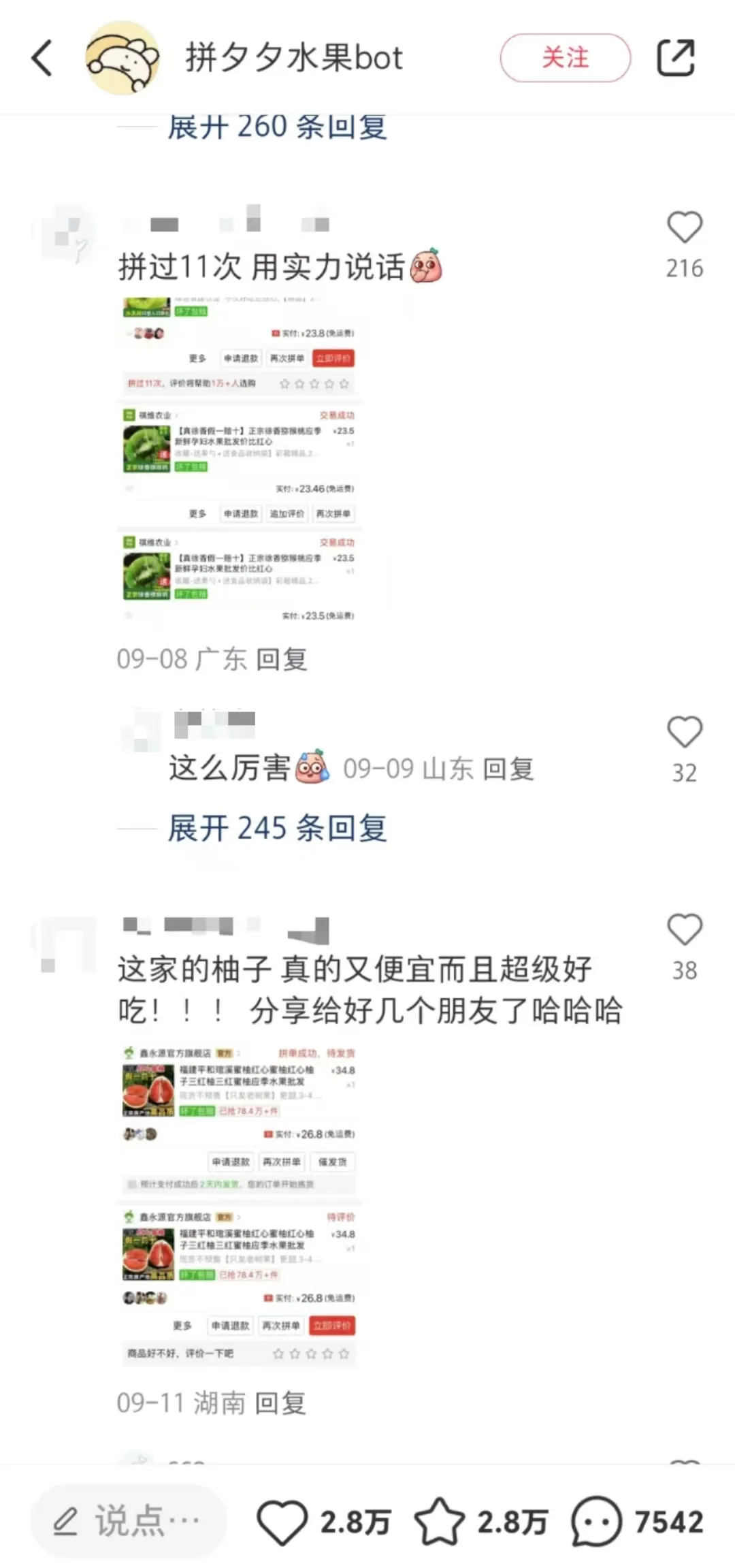 在小紅書,“拼夕夕水果bot”已累積5.6萬粉絲,一篇《球球大家寶藏水果店鋪》的筆記吸引超40萬讀者觀看,評論區無數拼到過好水果的網友激情開麥,曬出自己的獼猴桃、石榴、脆桃和文旦柚訂單;在微博,同名賬號的粉絲量已接近200萬,直逼拼多多官方微博;在豆瓣小組,組員們四處分享尋寶攻略“不要看訂單量要看回購率”“看發貨地是不是產地”“看一年是不是隻賣一季”……