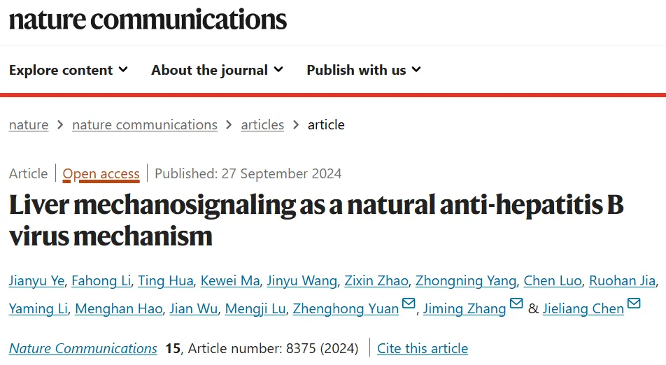 2024年9月27日,復旦大學陳捷亮、張繼明、袁正宏共同通訊在Nature Communications 在線發表題為“Liver mechanosignaling as a natural anti-hepatitis B virus mechanism”的研究論文,該研究揭示了一種涉及肝細胞機械環境和YAP清除肝臟嗜肝病毒感染的機制,為HBV治療研究和抗病毒藥物的開發提供了新的視角。