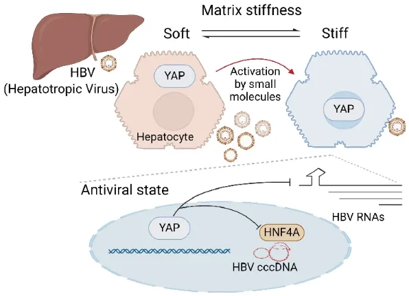 高基質硬度顯著抑制HBV複製並激活原代肝細胞培養系統中的YAP,這是機械信號傳導的關鍵分子。YAP激活顯著抑制HBV轉錄和抗原表達。一些YAP誘導的基因表現出很強的抗hbv作用。對HBV複製活躍的男性個體肝組織的單細胞分析顯示,YAP特徵激活與HBV轉錄水平之間存在顯著的負相關。在雄性小鼠模型中,腹腔注射YAP小分子激動劑可有效控制HBV。