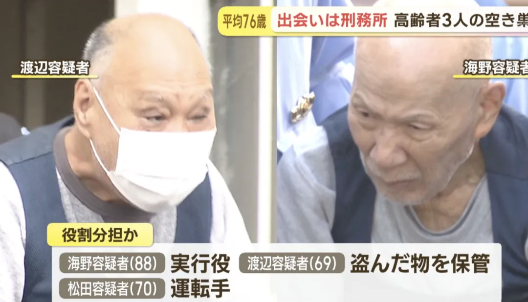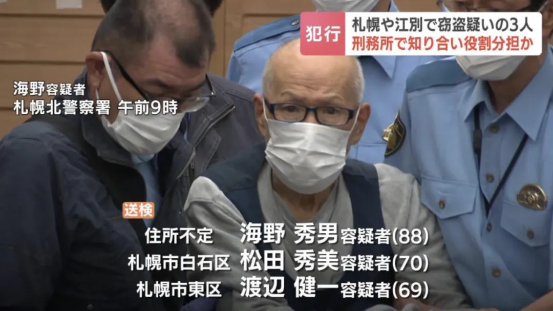今年7月,北海道警方逮捕了一個高齡盜竊團伙,三名嫌疑人的年紀分別是88歲、70歲和69歲。