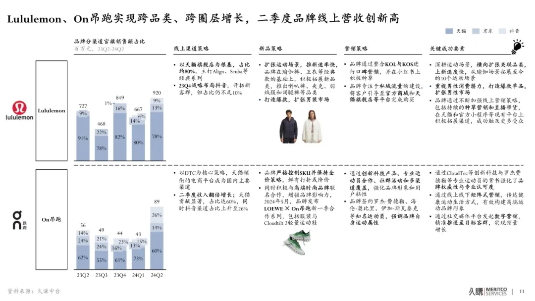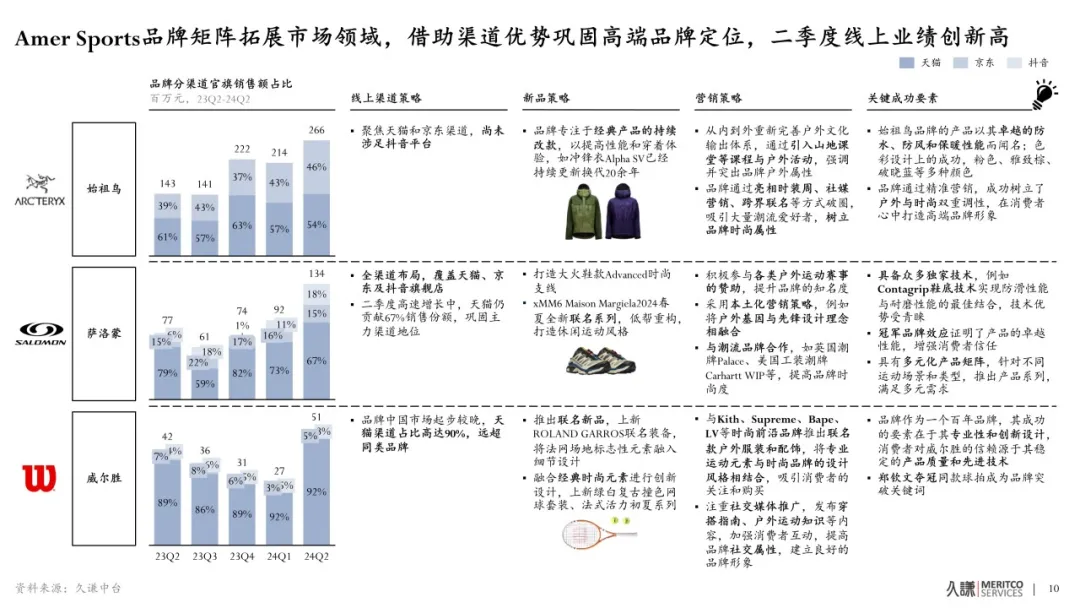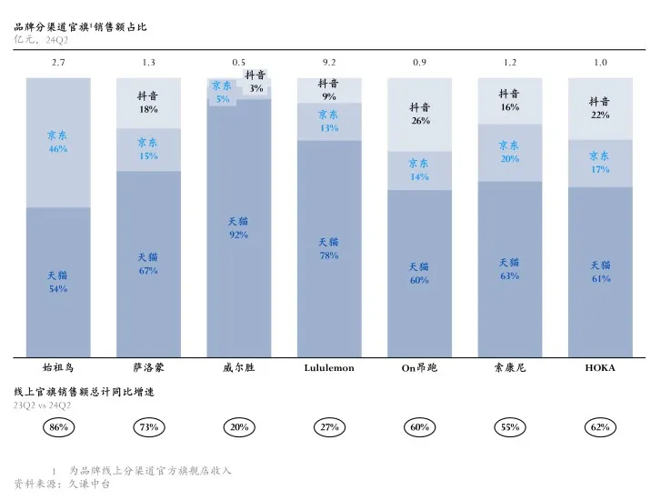 在線上,尤其是國內DTC渠道,中產新貴户外品牌表現尤為亮眼。Amer Sports旗下始祖鳥、薩洛蒙線上品牌旗艦店銷售額同比高增,分別增長86%和73%,On昂跑、索康尼、HOKA的增速同樣超過50%,Lululemon在Q2線上品牌旗艦店銷售額高達9.2億元,依舊保持20%的同比增長。