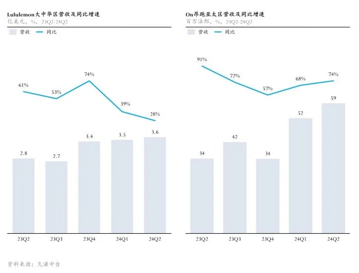 其中,Amer Sports大中華區營收同比增長54%;Lululemon大中華區實現28%的同比增長;On昂跑在亞太區的增長更是達到驚人的74%。